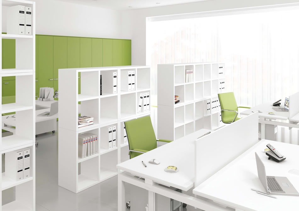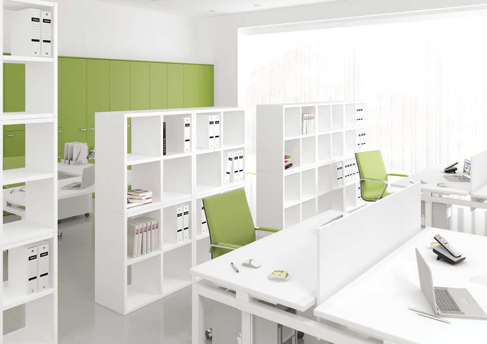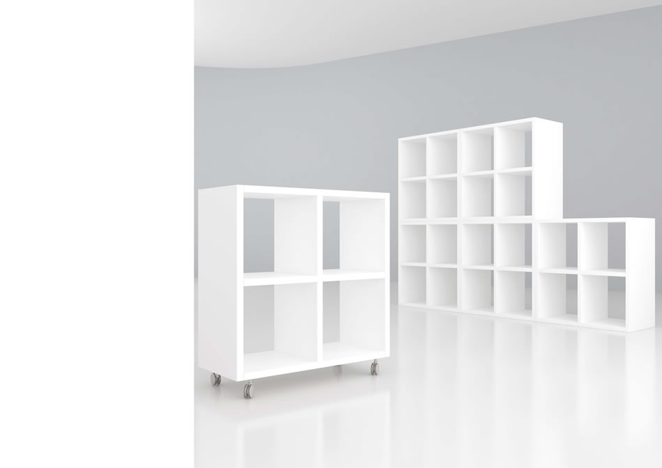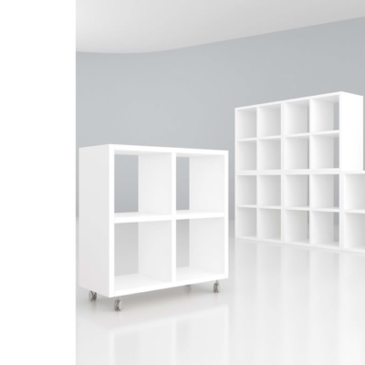 Serie di elementi a giorno realizzati in nobilitato colore bianco sp. 30 mm L.84 x P.41 x H.84, avente due divisori centrali che formano quattro vani a dimensione ottimale per l’archiviazione Dox.